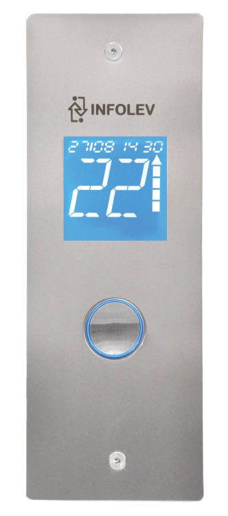 Botão em aço inox com seta indicadora de sentido do chamado (auto iluminado);