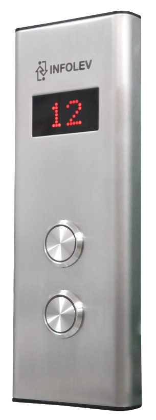 Botão modelo Plus em aço inox com seta indicadora do sentido do chamado (auto iluminado);