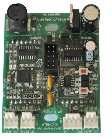 Nos comandos Infolev ou no kit DecodSe, possui um transmissor serial, que tem a função de coletar as informações atuais do elevador, tais como: pavimento atual, seta, gongo, status de PA, MT, etc, e transmitir até o indicador de forma serial, ou seja, através de apenas 2 fios (mais 2 de alimentação). Quando a informação chega até o indicador, ele a interpreta e consegue saber que marcação deve mostrar no display.